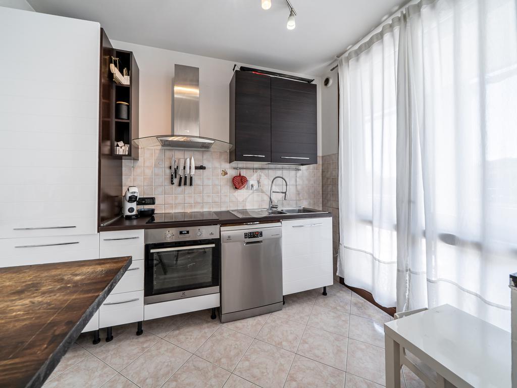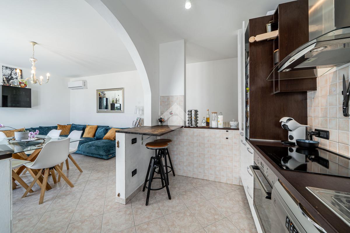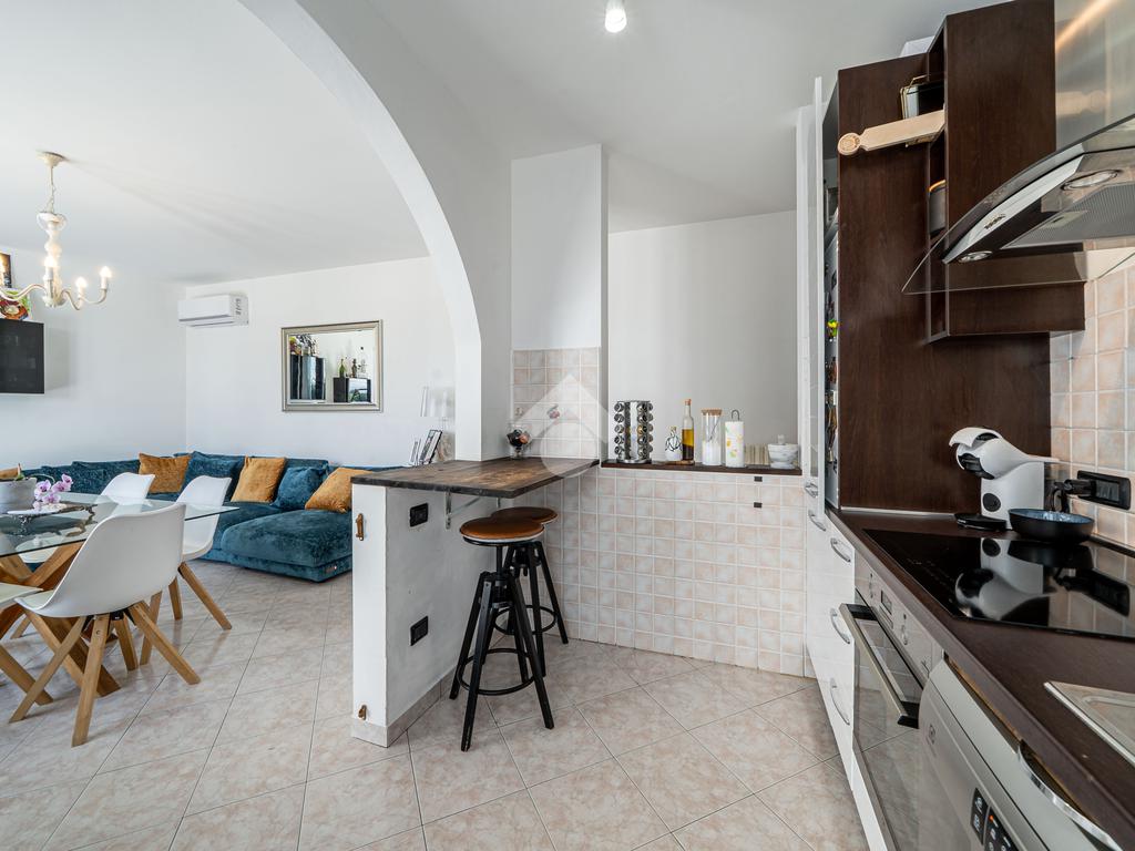 Entrando al piano terra troviamo la zona giorno ovvero la sala con zona cottura semi a vista, pensata per coniugare convivialità e praticità, oltre ad un bagno-lavanderia ed un piccolo ripostiglio nel sottoscala.