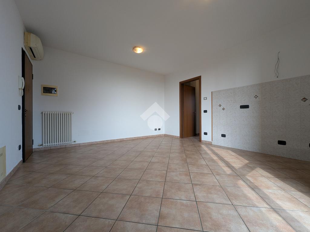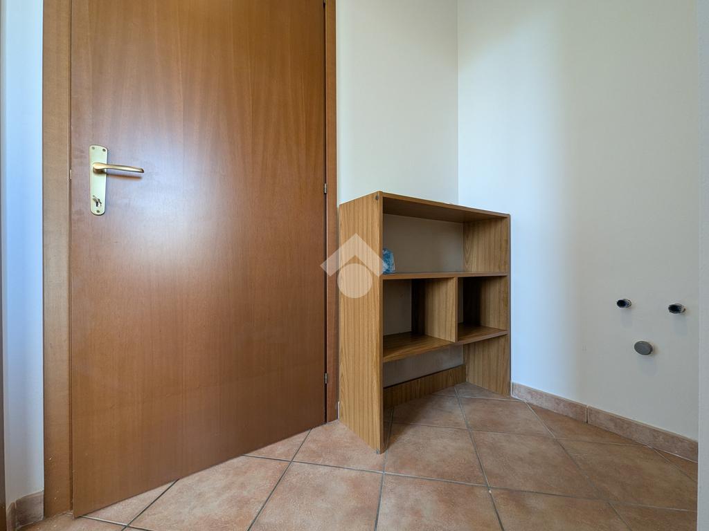 L’ingresso è direttamente nel soggiorno con angolo cottura, un ambiente luminoso che si affaccia sul balcone loggiato. Qui troviamo un pratico ripostiglio tecnico che ospita la caldaia e gli attacchi per la lavatrice, ottimizzando gli spazi interni.