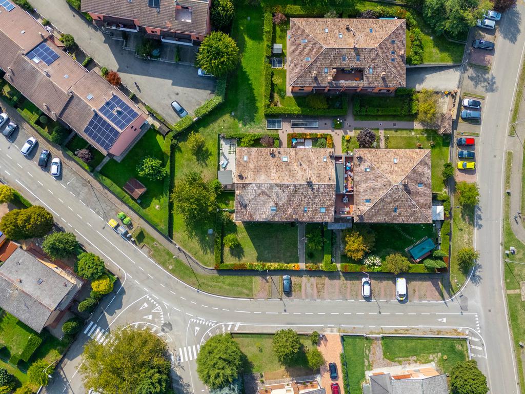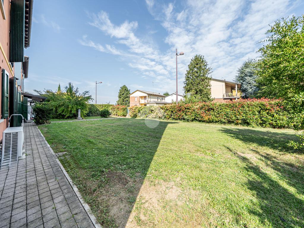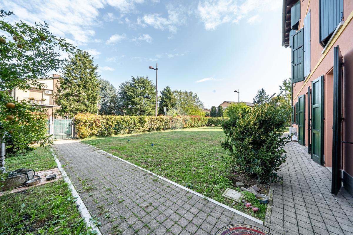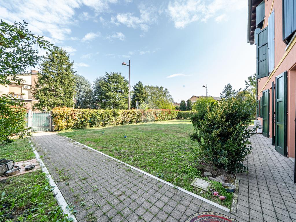 La vera peculiarità di questa soluzione è senz’altro il grande giardino privato, raro da trovare in contesti condominiali, uno spazio verde completamente recintato, contornato da siepi curate e impreziosito da un prato all’inglese, con camminamento pedonale che conduce all’ingresso indipendente dell’abitazione, rendendolo perfetto per chi ama vivere gli spazi esterni o ha bambini e animali domestici.