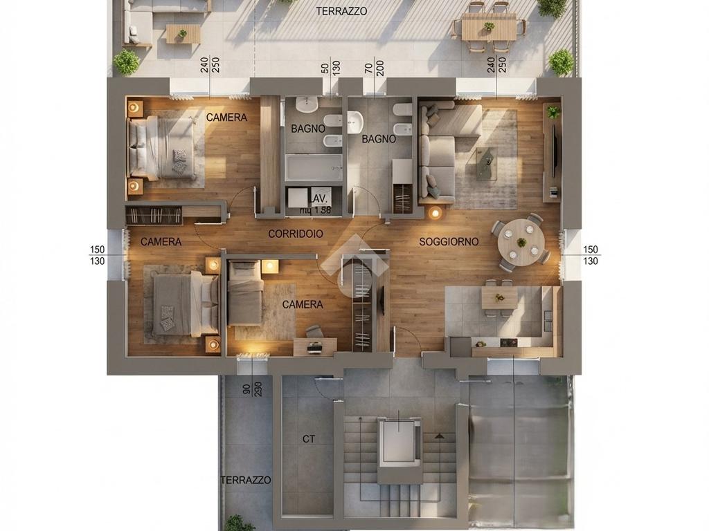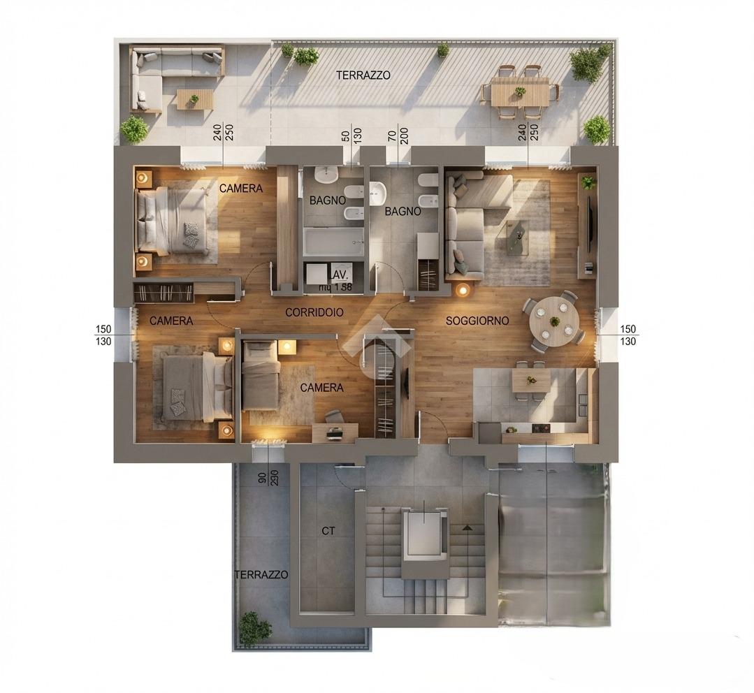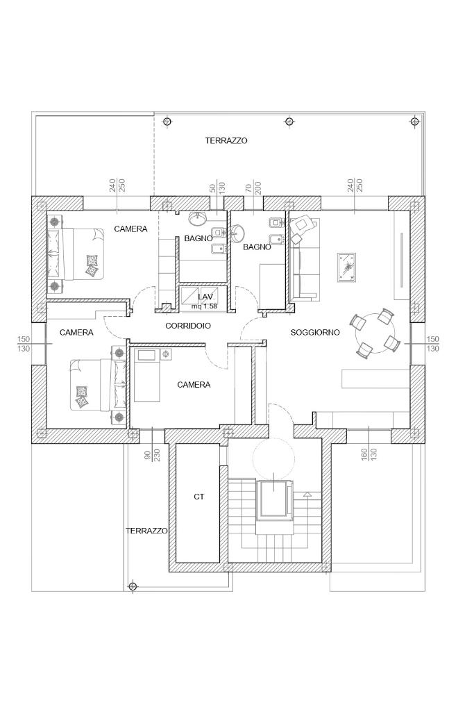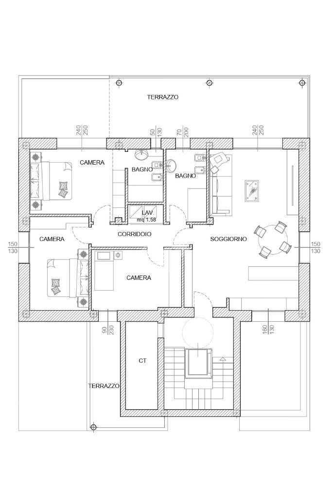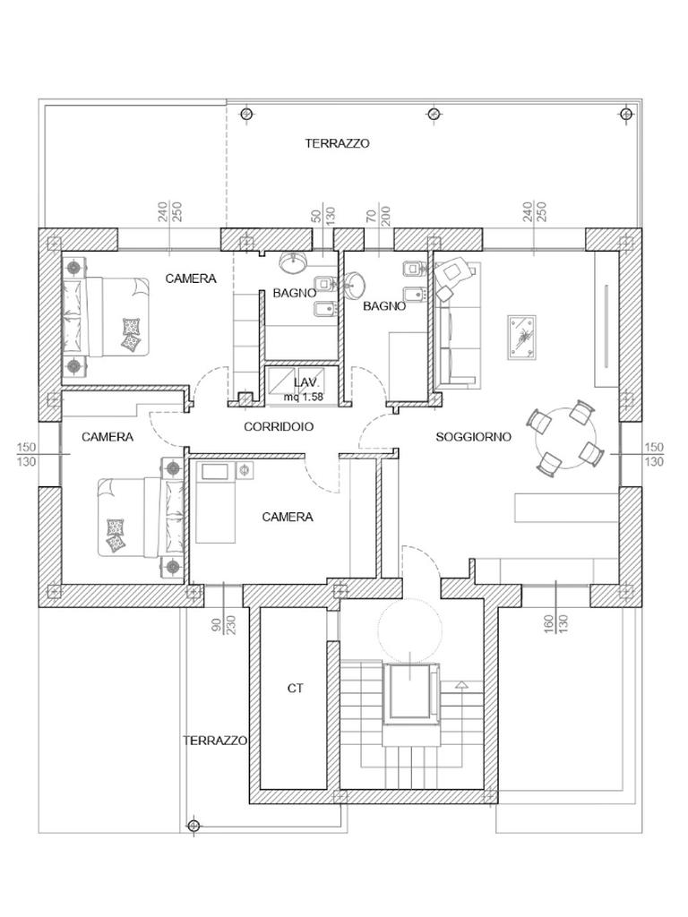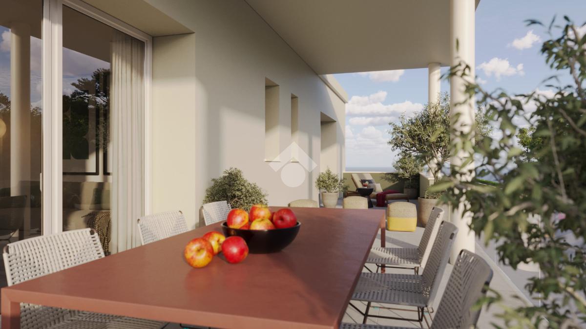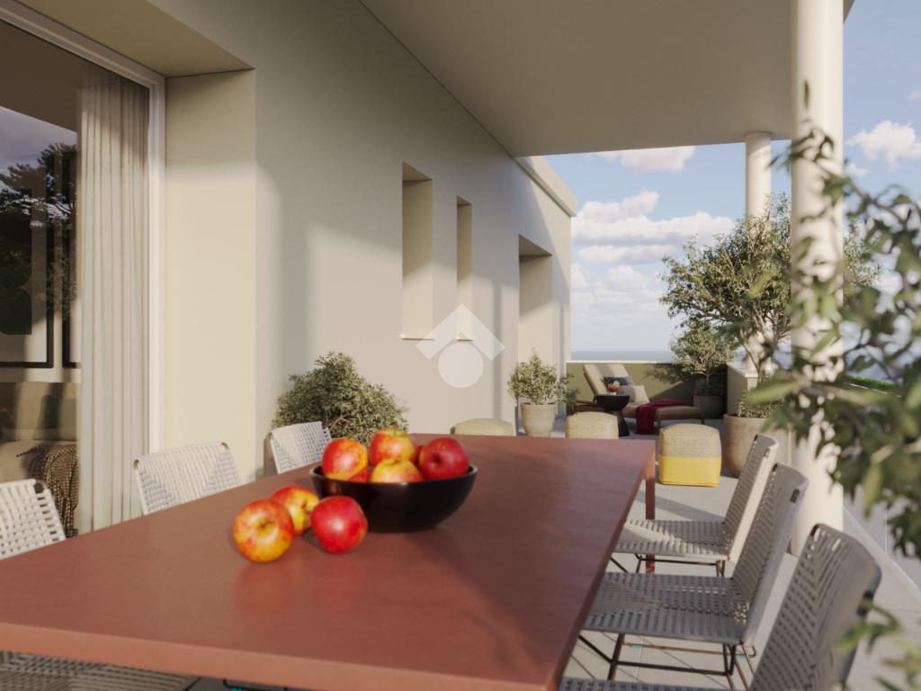 Questa area living si affaccia direttamente su un terrazzo di 40 mq, esposto a sud, parzialmente coperto, ideale per essere attrezzato con tavoli da pranzo per cene all'aperto e/o ad area relax.