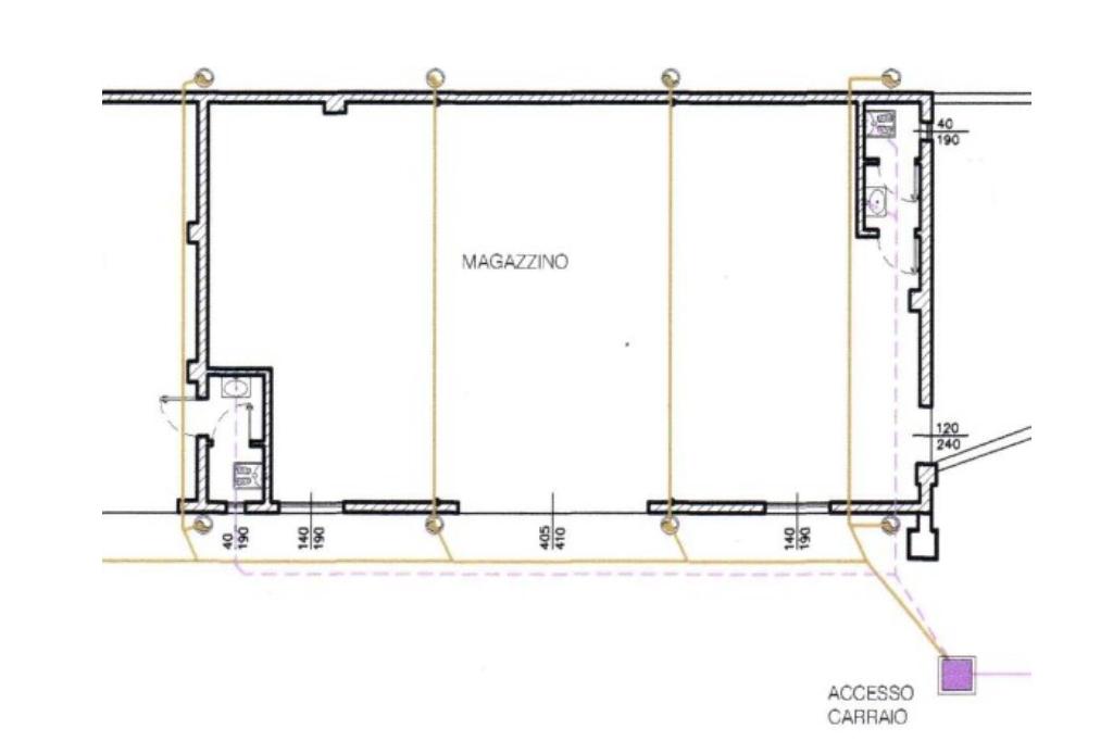 Presenta un'apertura di 4 m con altezza 4 m, all'interno si presenta come un unico ambiente all'interno del quale vi è il servizio, inoltre è stato ricavato anche un locale chiuso ad uso ufficio.