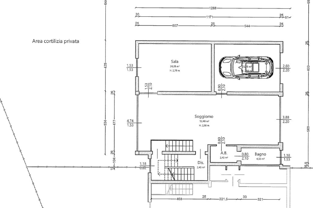 Completano il piano un primo bagno con antibagno ed il garage collegato internamente all’abitazione.