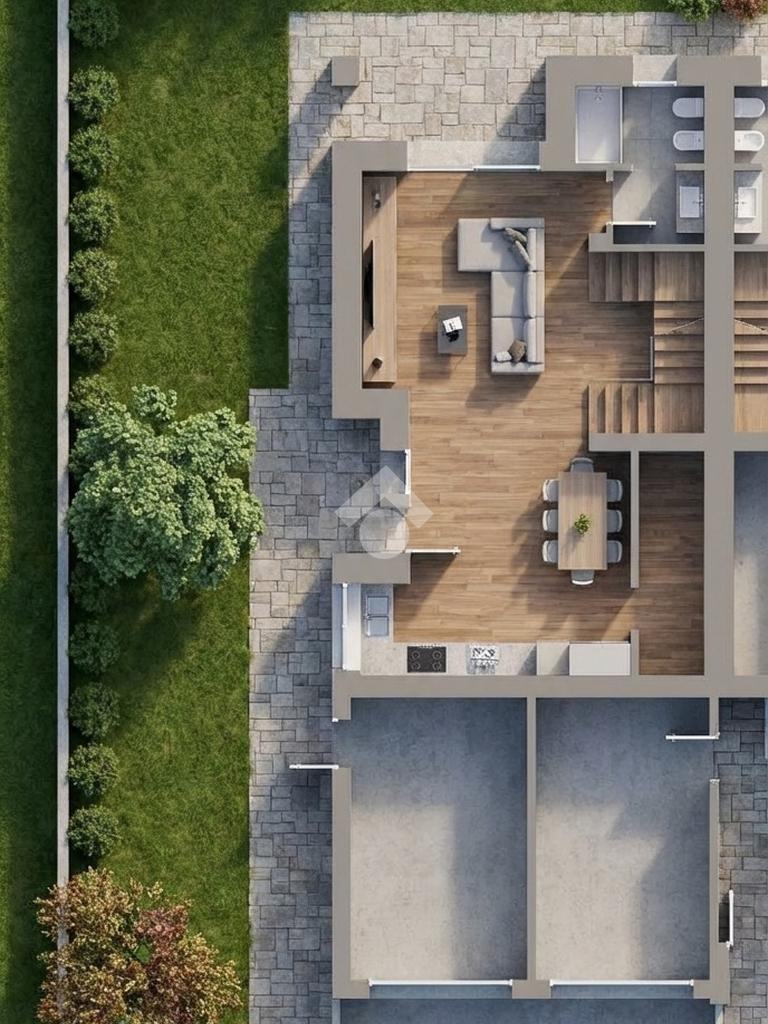 La costruzione è caratterizzata da un design moderno e linee eleganti, si inserisce perfettamente nelle tendenze contemporanee dell'abitare, con forme dinamiche e funzionali.